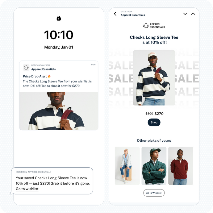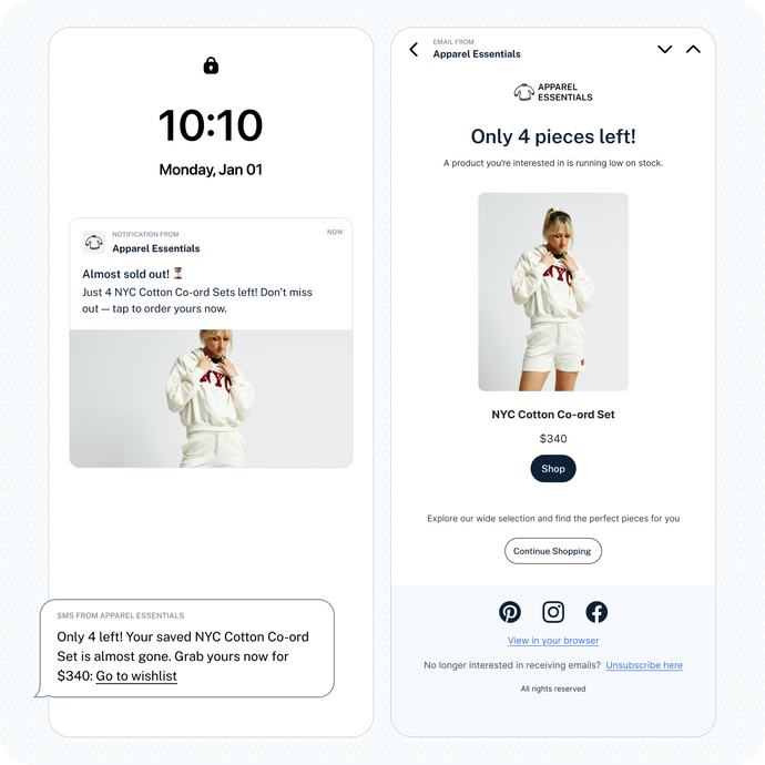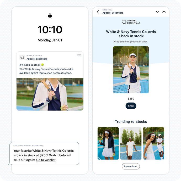 When a sold-out item comes back in stock, let interested shoppers know immediately. Whether via email, SMS, or push, these alerts help recover lost revenue by turning back-in-stock moments into purchases.