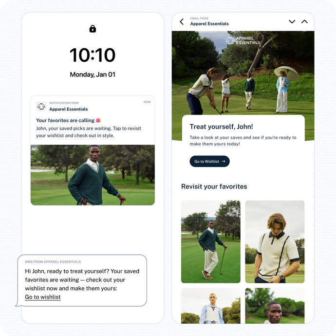 Send personalized emails or texts featuring personalized products your shoppers have wishlisted. These timely nudges help rekindle interest and drive conversions by reminding shoppers of items they already love.